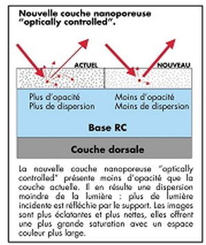 ILFORD – rapidement évoqué le mois passé, les nouveaux papiers de la gamme GALLERIE (smooth pearl en emballage rouge et smooth gloss en emballage vert) sont disponibles en grand format (4x6 ou A3+) Ces papiers bénéficient de la nouvelle technologie de couches nanoporeuses « Optically Controlled » - voir image- qui assure non seulement une meilleure perception visuelle grâce à une couche moins opaque mais également un meilleur maintien dans le temps, pour autant que l'encre de l'imprimante soit également durable. |