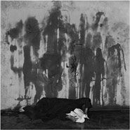 photographieLa chambre est un univers clos replié sur lui-même, une cellule intime qui dénonce et dévoile les travers de l'état mental. Les photographies de Roger Ballen explorent cet espace fragile tout en respectant la nature de chacun de ses modèles. Même si les photographies sont prises dans leur quotidien, ils ont accepté la mise en scène de leur corps. Ils sont souvent allongés, de trois quart, c'est la position du repos et du sommeil qui les confine encore davantage dans leur esprit plus ou moins apaisé. Parfois, ils sont de face et regardent le spectateur fixement sans aucune pudeur jusqu'à l'indécence. Le caractère comique, décalé de certaines situations donne une distance si bien que les personnes deviennent attachantes. photographieRoger Ballen introduit souvent des fils de fer ou barbelés  qui s'affirment comme des éléments graphiques déterminants. Au delà de l'aspect symbolique, c'est davantage leur plasticité qui est mis en exergue. Le graphisme est fondamental surtout qu'il est directement présent notamment à travers des dessins qui sont sur les murs. Même primitif, le dessin est la révélation encore une fois d'un état mental. La composition est révélatrice du style de Roger Ballen dans un format carré qui renforce l'idée du cloisonnement, le sujet doit faire face à une étendue qui plane au dessus de lui. L'espace apparaît envahissant et engloutit celui qui l'occupe, il est la trace de l'âme en souffrance. Dans Twirling wires, un immense amas de fil de fer barbelé est suspendu tel un nuage orageux ou un essaim de frelons au-dessus d'une tête totalement asphyxiée et comprimée entre lui et le cadre du format photographique. Seul, le regard levé au ciel et épeuré surgit alors que tout le reste du corps est camouflé dans une couverture grise.