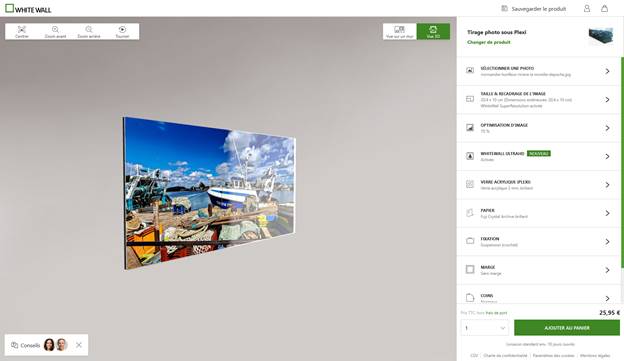 Vous avez cliqué sur la barre verte et le configurateur s’affiche. Par défaut, en petit et adossée au mur, l’image apparaît. Mais une simulation en 3D, plus attrayante est possible. Toutefois, le plus important est le panneau de droite. Vous pouvez, et devez, c’est préférable, vérifiez chaque section pour que votre tirage corresponde à vos souhaits.