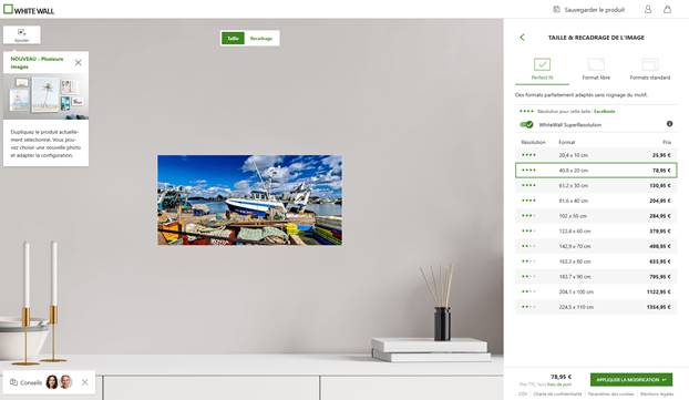 Le prix affiché en bas correspond au prix de base pour un format de 20,4*10cm . En cliquant sur taille et recadrage, d’autres formats sont disponibles. Et les prix s’élèvent rapidement. Dès la deuxième option, 40,8*20cm, il est de 78,95€ pour aller jusqu’à 1 354,95€ pour une taille Max 224,5*110cm. Les étoiles vertes certifient l’adéquation de la résolution par rapport au format choisi.