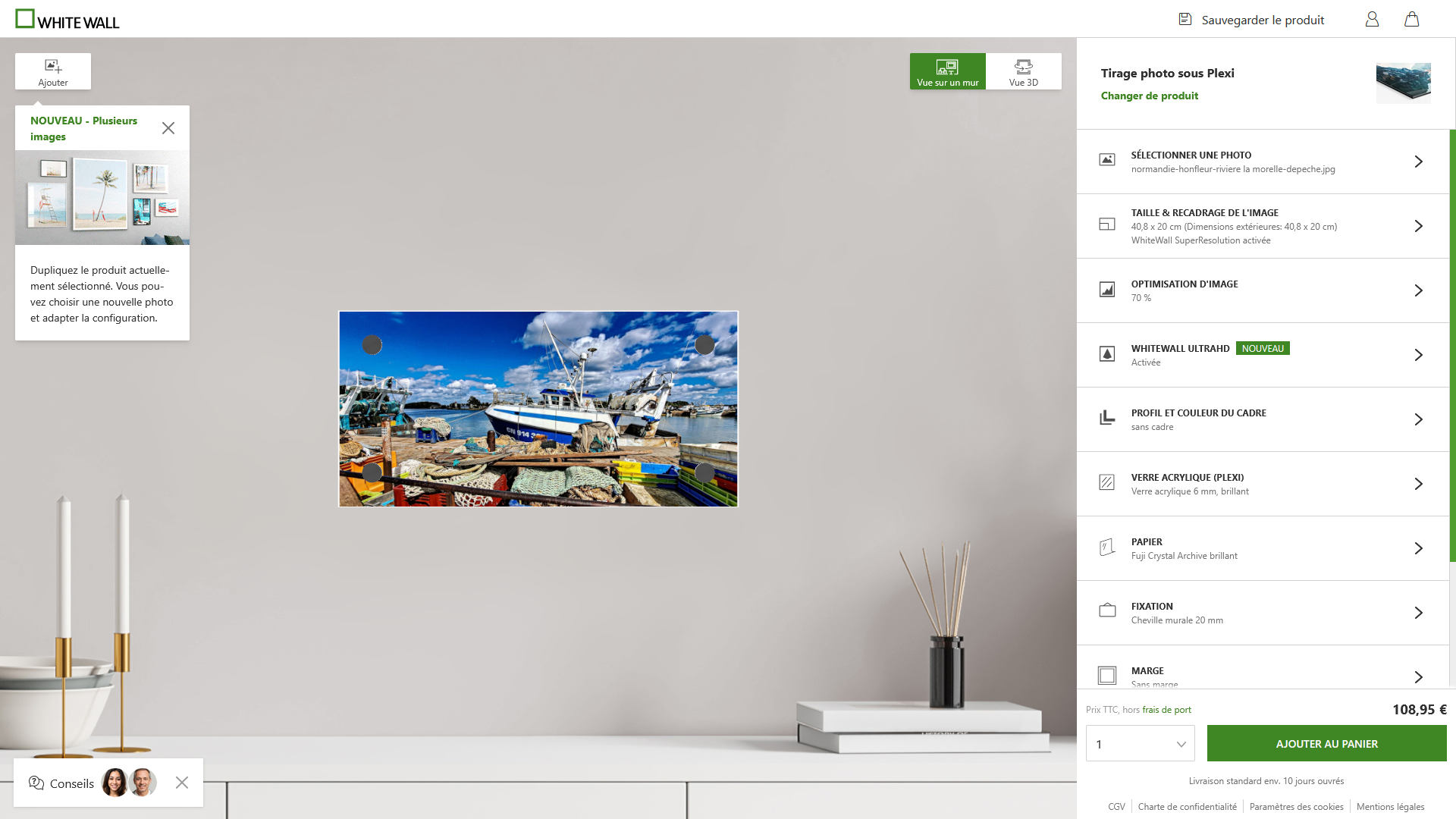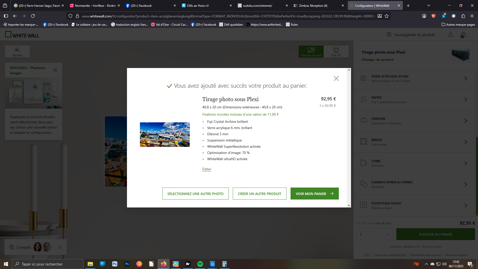 histoire de vérifier que tout est en ordre et qu’aucune erreur n’a été commise, une fenêtre, reprenant votre image avec toutes les options comprises dans le prix indiqué – remarquez que le système de fixation valant 11€ est inclus – s’affiche. Vous pouvez en toute tranquillité soit valider votre demande en allant dans votre panier, soit revenir sur vos critères.
