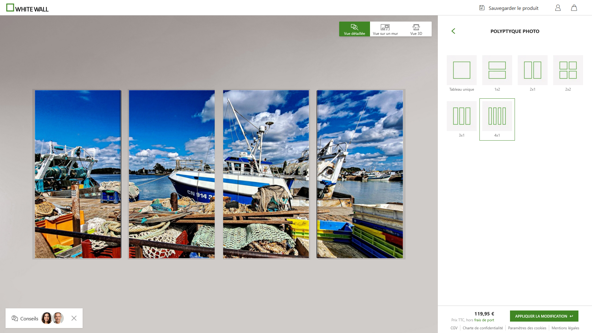 Il existe d’autres options plus ou moins intéressantes selon les besoins. Par exemple, Polyptyque Photo vous permettra de faire jusqu’à 4 segments de votre image ; ce qui peut être une bonne idée faisant sortir celle-ci des autres tableaux. Le surcoût est de 27€, ce qui peut être intéressant. Passons maintenant au nerf de la guerre : le paiement !